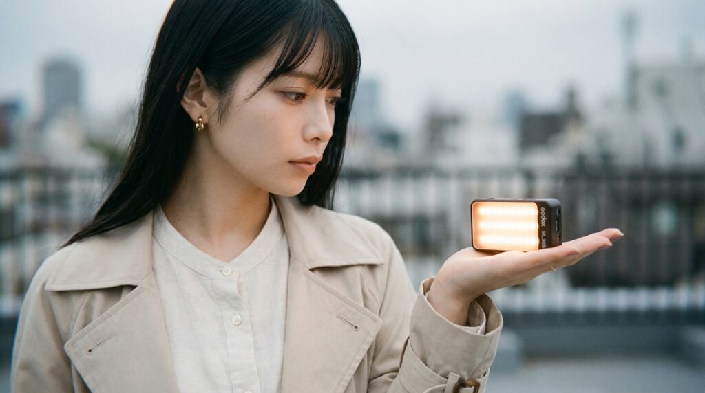 Godox ML30Biのバイカラー機能は、3200K(電球色)から6500K(昼光色)まで無段階で色温度を変えられます。これが何の役に立つかというと、混合光への対応です。例えばカフェで固定色温度のライトを当てると、環境の電球色照明と光の色が喧嘩して顔がまだらになる。バイカラーなら環境光に色温度を合わせられるので、光が自然に溶け込む。プロがこれを重視する理由がよくわかります。