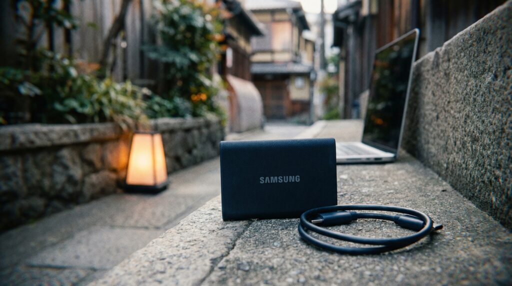 Samsung T9 Portable SSDの読み出し速度は最大2,000MB/s(USB 3.2 Gen 2×2接続時)。4K素材の転送が詰まらないどころか、SSD上で直接DaVinci Resolveを走らせても快適に動くレベルです。1時間のフッテージを移し終えるまでが体感10分以内。作業の密度がガラッと変わります。