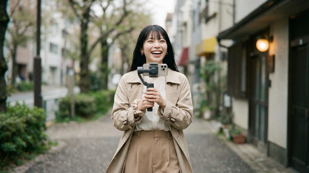 歩きながらスマホで撮った映像、あとで見返してみるとびっくりするくらいブレていますよね。手ブレ補正がついていても、歩行のリズムや足音の振動までは消えてくれない。でもこれ、ジンバルを使うだけでスーッとした映像に変わります。