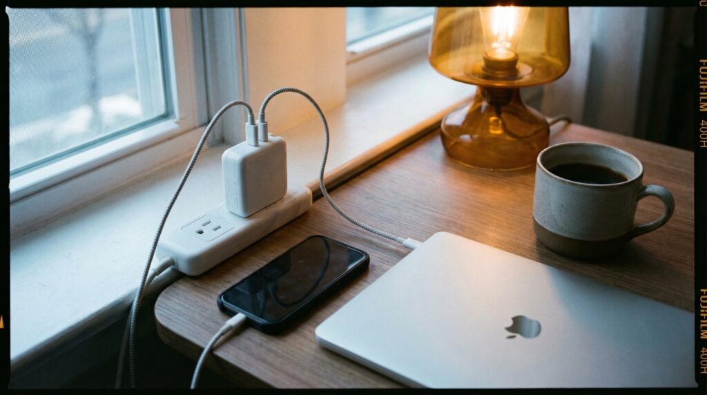 日本のメーカーが出している3ポートのコンパクト充電器が、いまめちゃくちゃいい感じです。USB-C×2+USB-A×1の構成で最大65W出力。ノートPC・スマホ・イヤホンを同時にフル充電できる。何がすごいって、そのサイズ感。クレジットカードより少し大きいくらいのコンパクトさで、カバンに入れても邪魔にならない。出張や旅行のとき、かさばるACアダプターから解放された感動は想像以上でした。