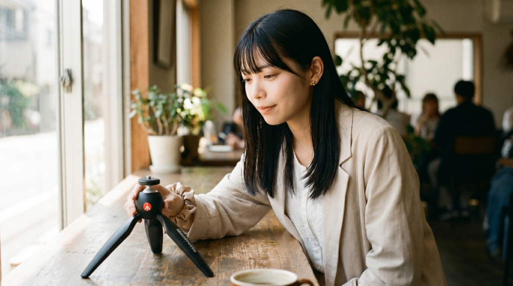 高さは最大21cm程度と低いけど、卓上で固定したい場面ってけっこうありますよね。カフェでのブツ撮り・料理の写真・自撮りのローアングル・動画の卓上固定。そういうシーンにサッと応えてくれます。